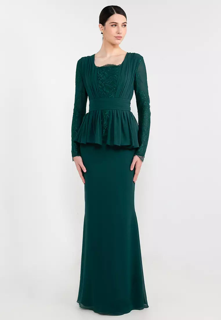 Introducing "Addie," a sophisticated and intricately designed dress that blends timeless lace with elegant drape details. This piece is perfect for formal gatherings, offering a rich, captivating look with its deep green hue and meticulous craftsmanship.