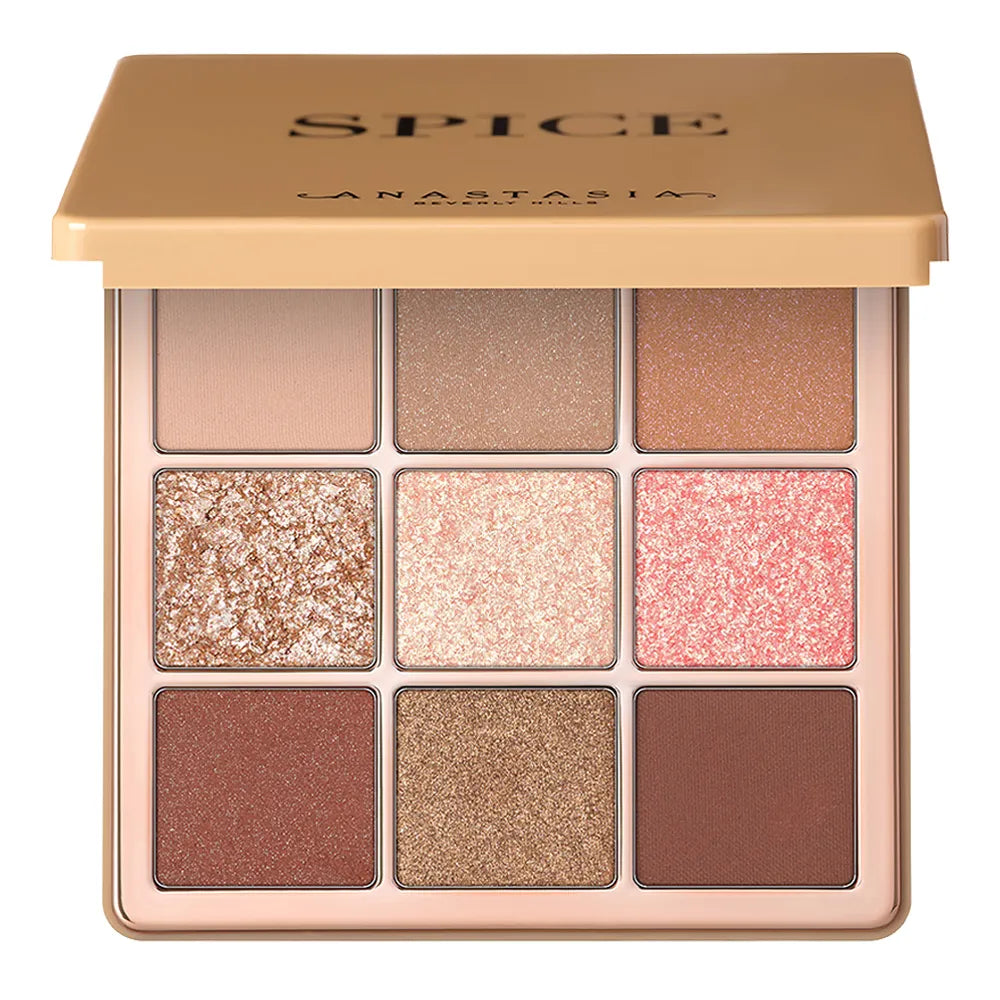 Anastasia Beverly Hills Spice Mini Eyeshadow Palette contains 9 full-pigment shades ranging from warm-toned neutrals to brilliant golds in matte and metallic finishes. This essential mini eyeshadow collection features ABH’s highly pigmented, easy-to-blend formula and offers a versatile color range for creating everything from subtle to dramatic eye looks.