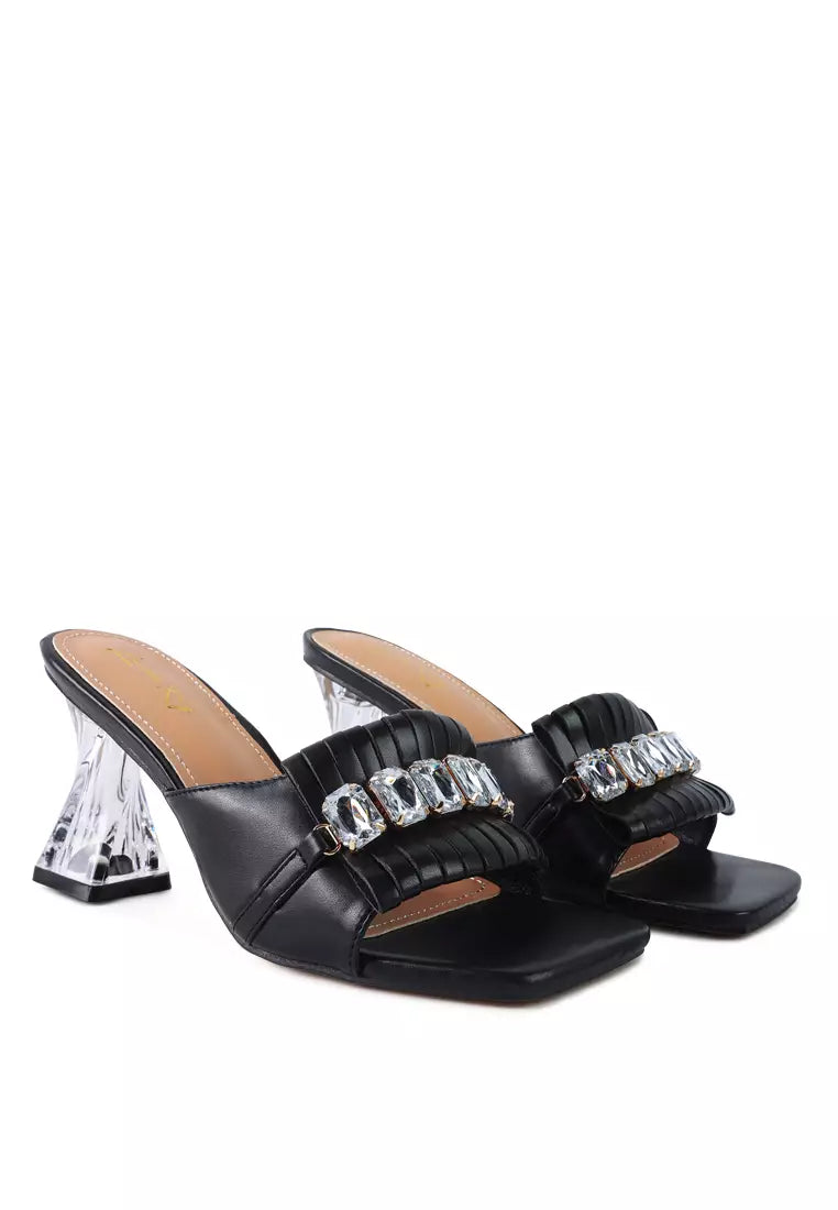Clear Heel detail sandal with ruched straps and rhinestone details looks gorgeous. The comfortable mid high heels are perfect to brunches and casual occasions - come with soft padded lining which cuts strain.