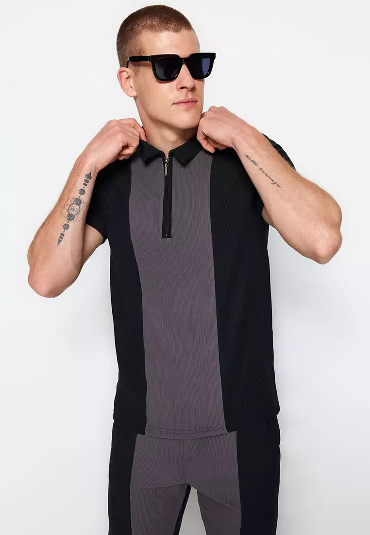 Black Men's Regular/Normal Cut Ottoman Color Block Zippered Polo Collar T-Shirt