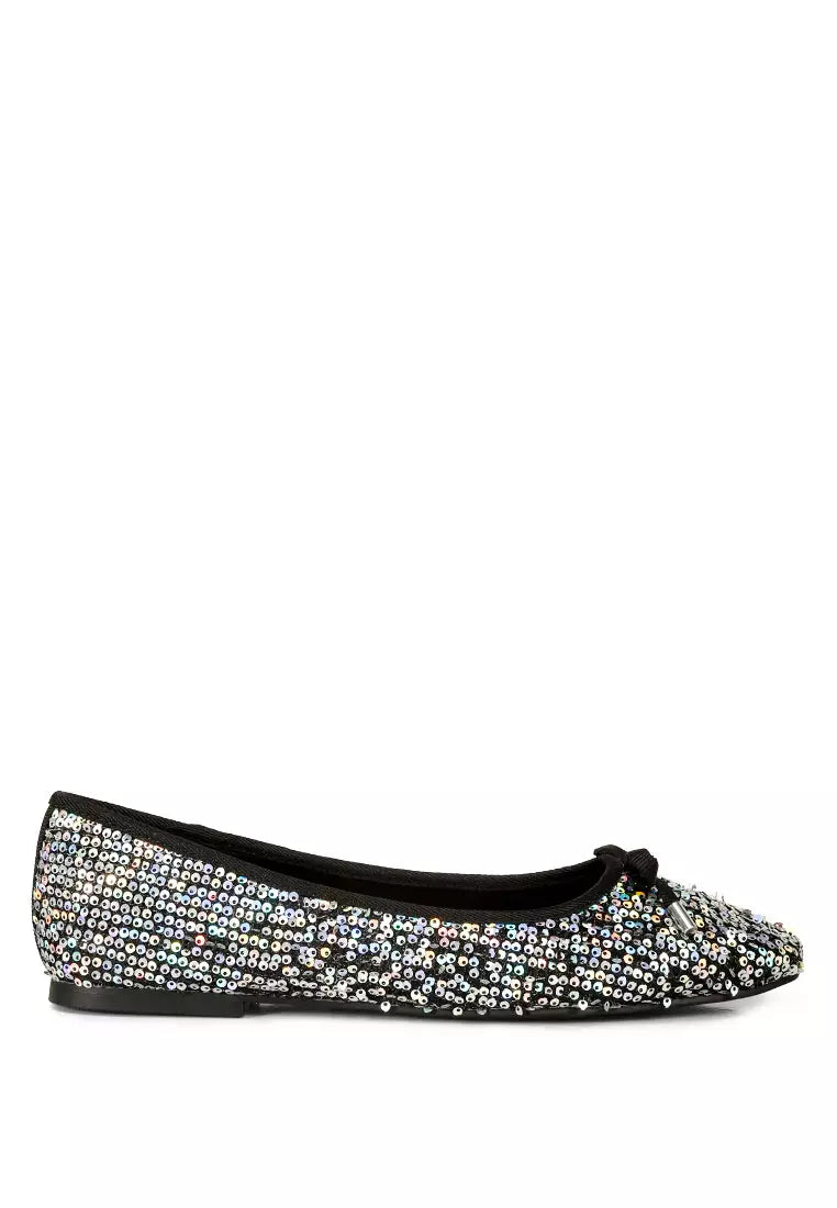 Outer Material- Sequin Embellished Textile Outer Sole - Closed Almond Toe Slip On Flats Bow With Metallic Tip Detail Lightly Cushioned Insoles