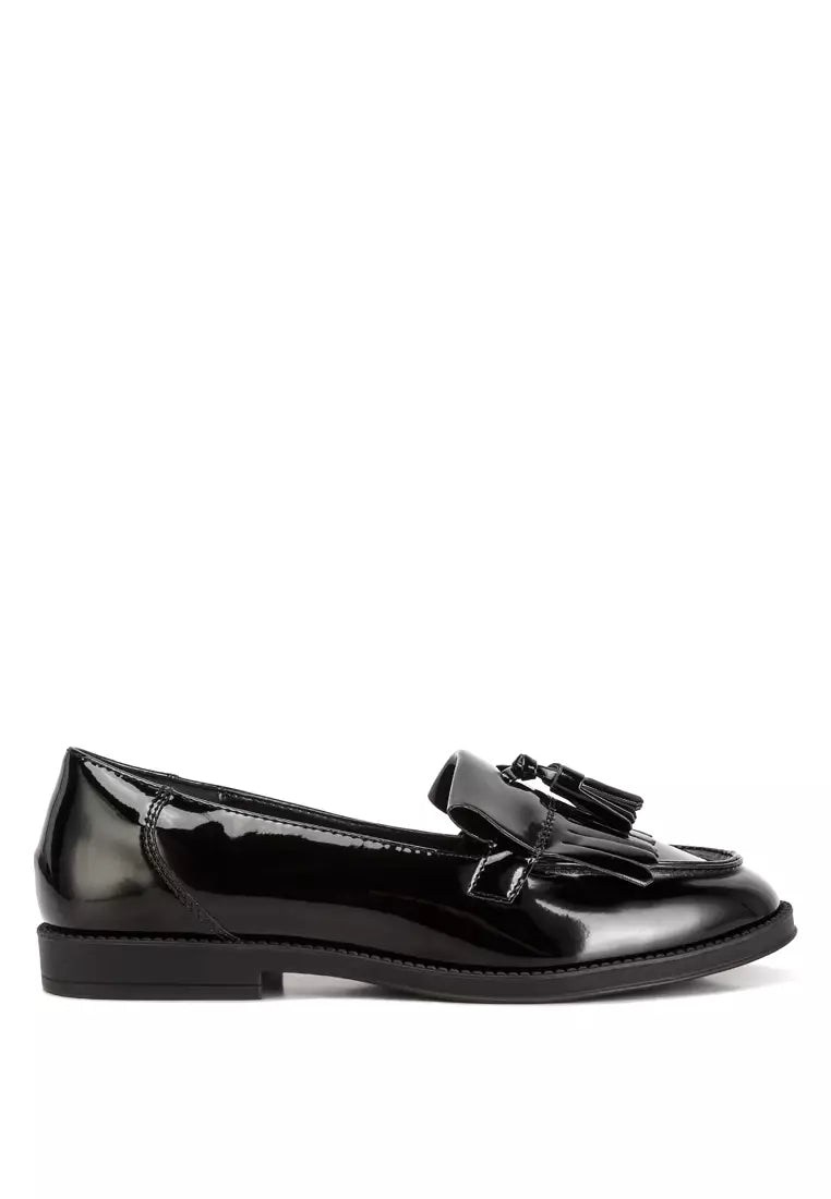Outer Material - Patent Faux Leather Outer Sole - TPR Closed Almond Toe Slip On Loafers Fringe Detail on Tongue Tassel Detail Lightly Cushioned Insoles