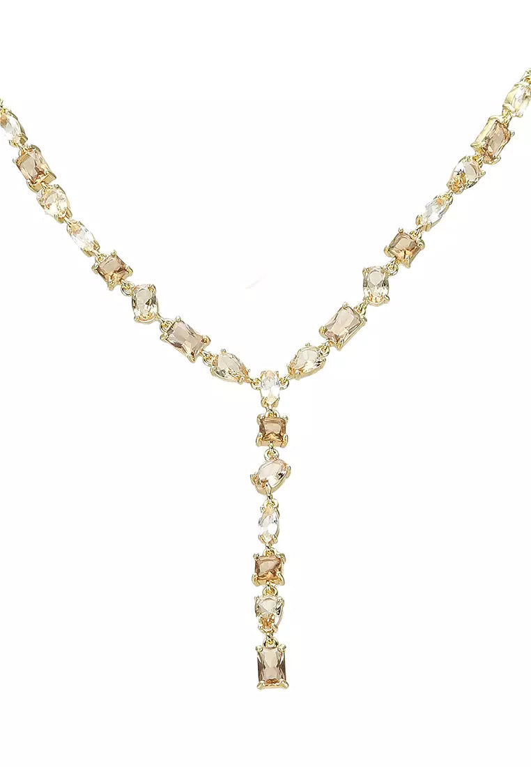 The Brillar Y Necklace is a statement piece that embodies both grace and opulence. Fashioned with an eye-catching Y-drop design, this necklace features a cascade of rectangular-cut stones that capture the light with every movement, creating a dazzling display. The gold-tone chain accentuates the warmth and richness of the design, ensuring that this necklace won’t go unnoticed.