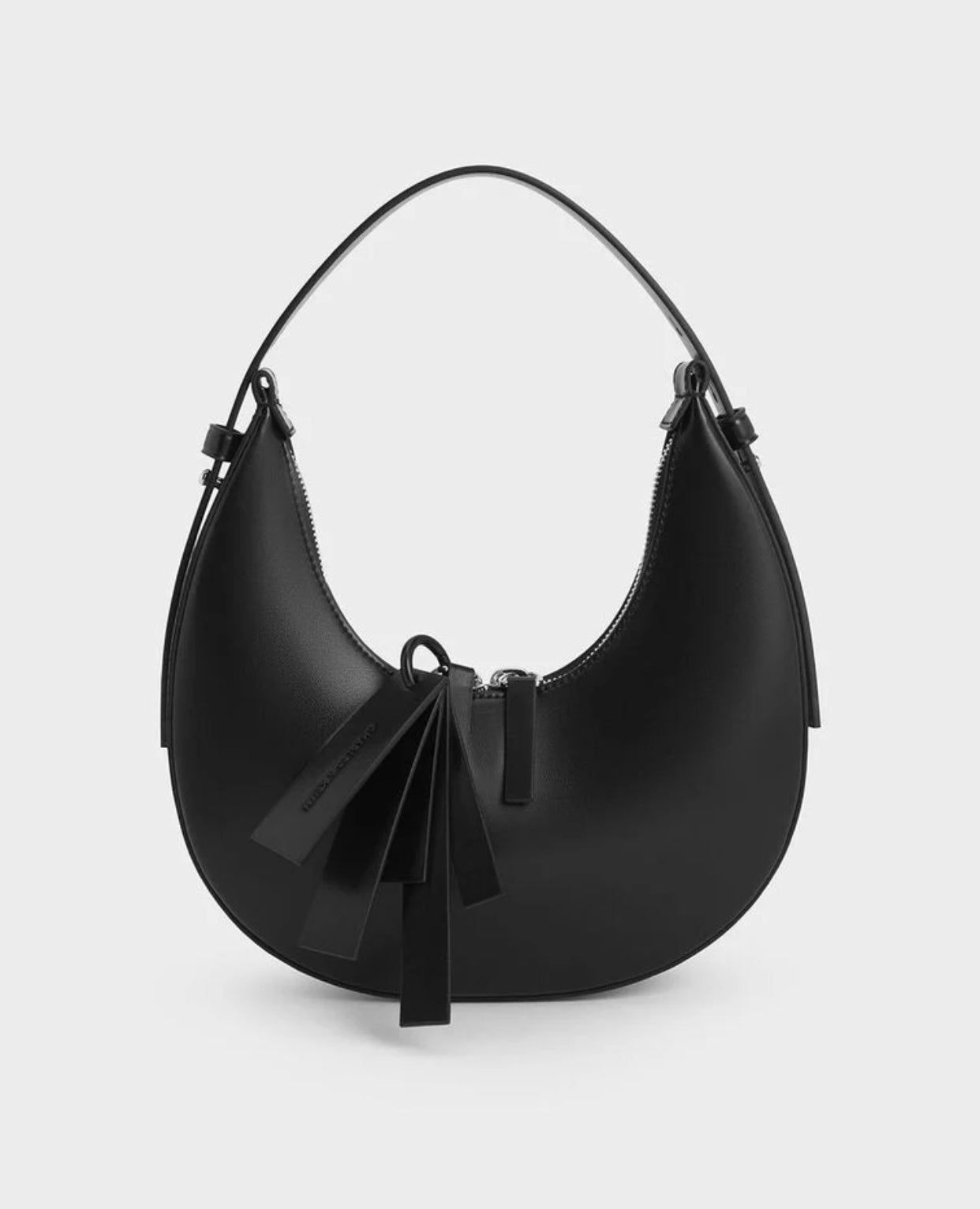 Black shoulder bags are a staple in every wardrobe, and this one will refresh your collection. Sleek curves have been rendered in an inky noir finish for a timelessly elegant piece that also feels subtly edgy. As a distinctive detail, the keychain charm sets it apart -- the rest of the exterior is minimalist and sophisticated. Complete with an adjustable strap for a tailored fit, this carrier is perfect for casual and dressy functions alike.