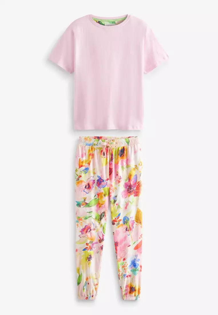 The short sleeve t-shirt offers a relaxed fit and the soothing pink tone complements the overall tranquil vibe of the set. Paired with relaxed-fit bottoms that feature an enchanting floral print bursting with vibrant colors, these pyjamas bring a touch of springtime cheer to your sleepwear collection.