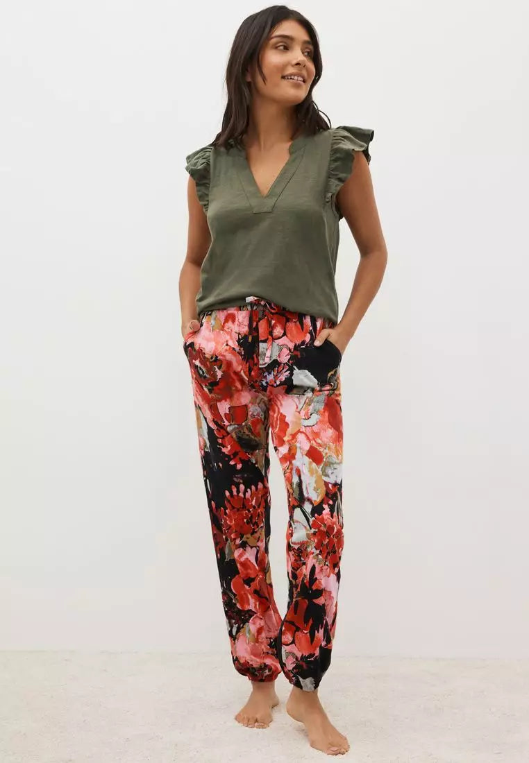 Paired with the top, the pyjama bottoms are a celebration of color and pattern. Adorned with a bold floral print, they bring an energetic and joyful mood to your sleepwear collection. The elasticated waistband ensures these bottoms sit comfortably without pinching, making them perfect for a restful sleep or a day of lounging around the house.