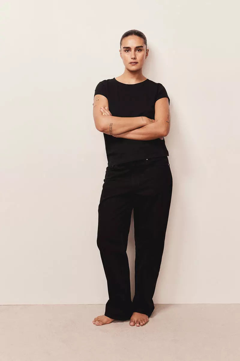 The Cotton T-shirt is a simple, yet classic design. It speaks to the basics of style with a regular fit that complements any silhouette. Its short sleeves and round neckline create a timeless look that is versatile for any casual occasion. The solid black color of the tee makes it a perfect canvas for any outfit, allowing for easy pairing with a variety of bottoms and layers. Made from soft jersey fabric, primarily composed of cotton, this T-shirt promises breathability and comfort. Whether dressing down for a relaxed day or styling up for a casual outing, this essential piece is a staple in any wardrobe, offering endless styling possibilities.