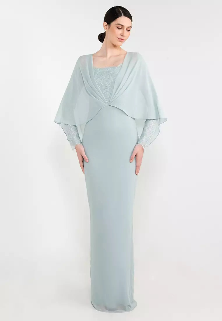 The dress features a unique high low cape overlay, adding a dramatic yet refined touch to the classic maxi style. Crafted from delicate chiffon and lace, the dress is fully lined, ensuring both comfort and modesty. The scallop square neckline adds a vintage-inspired charm, while also framing the face beautifully.