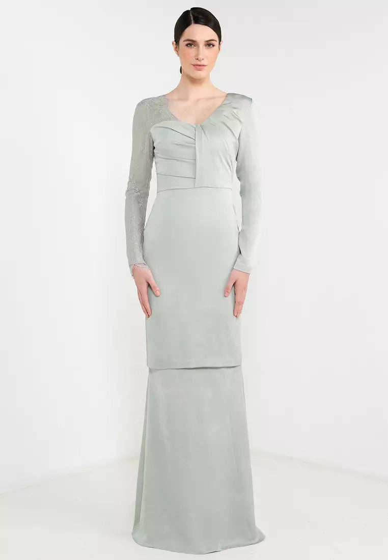The "Enid" ensemble is a testament to refined elegance, designed to make a statement at any formal event. It features a pleated drape front brocade top paired with a contrasting lace sleeve that enhances its unique style, set against a soothing, soft gray palette.