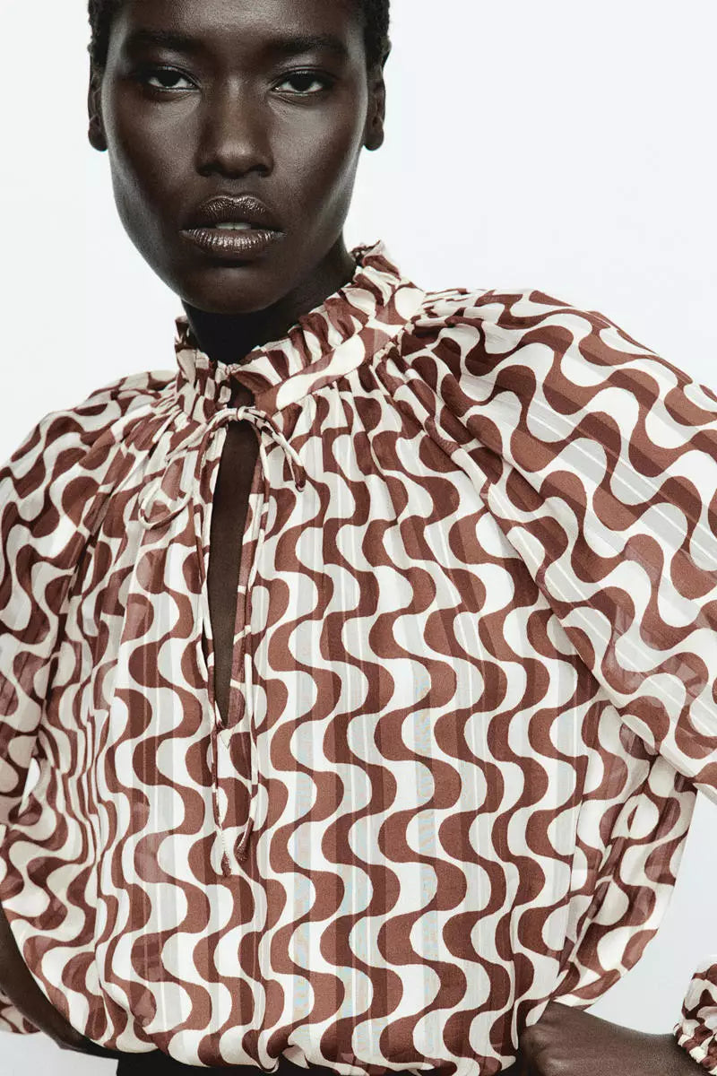 Blouse in an airy crêpe weave. Small, frill-trimmed stand-up collar with narrow ties and a V-shaped opening at the front. Long, voluminous balloon sleeves in a raglan cut with narrow, covered elastication at the cuffs. Unlined.