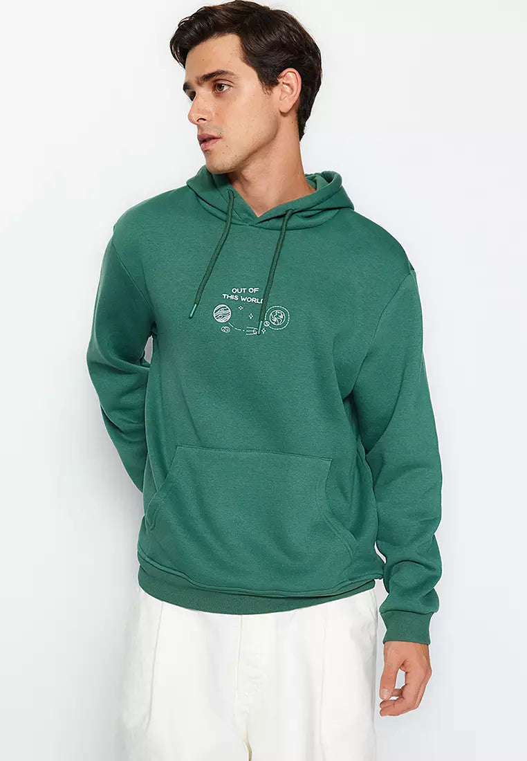 Green Men's Regular/Regular Cut, Space Embroidery Hoodie. Sweatshirt.