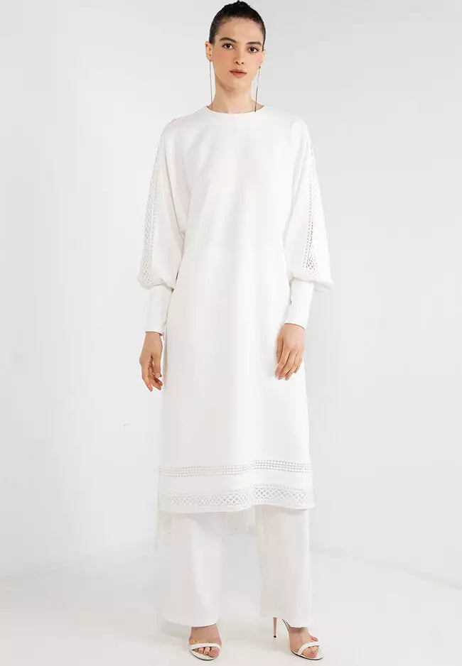 Discover the epitome of refined grace with the Ivory Avalyn midi dress. This garment exudes a serene elegance, perfect for those who appreciate a blend of modesty and contemporary style. The monochrome color palette ensures a versatile piece that can be dressed up or down for various occasions.