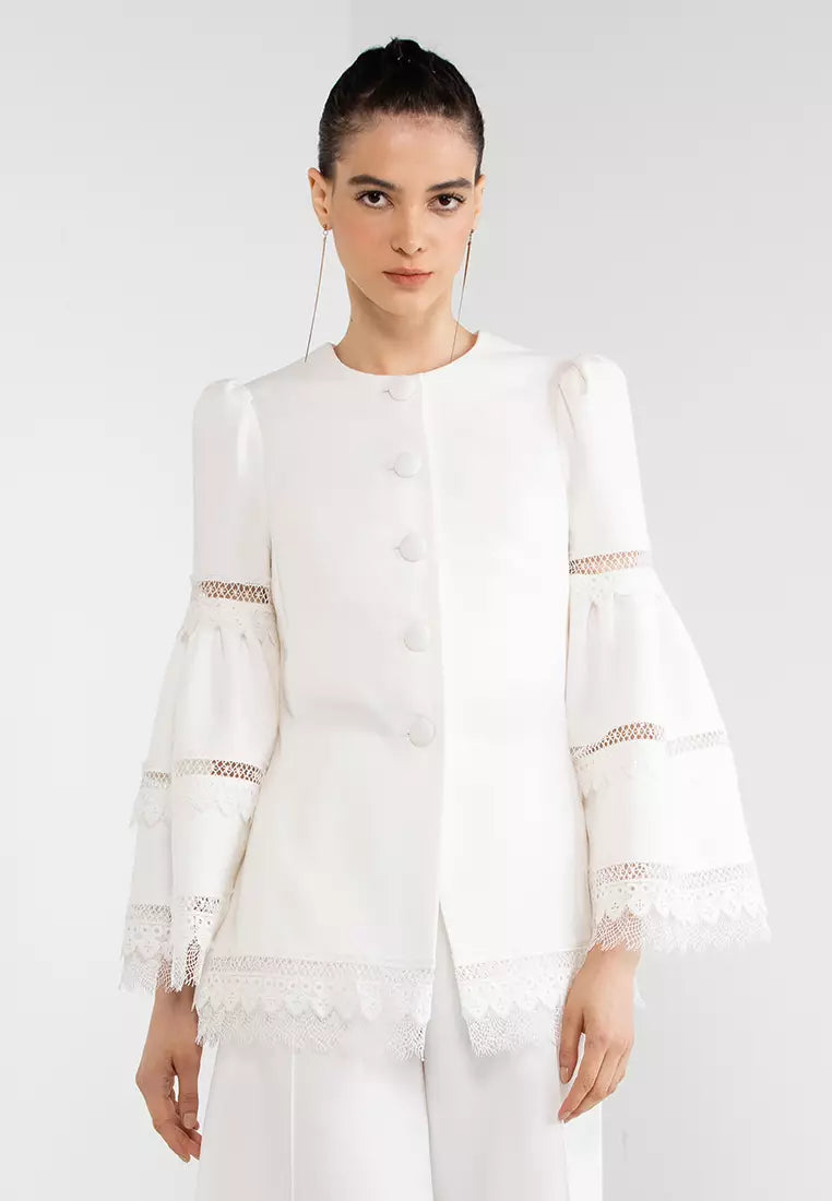 The "Ivory Kestrel" top presents a stunning combination of classic elegance and contemporary detailing. Crafted in a pristine ivory hue, the top features a clean, round neckline and a hidden front fastening that allows its structured silhouette to take center stage. Exquisite lace adorns the bell sleeves and waistline, adding a touch of romanticism and intricate texture. The bell sleeves bring a dramatic flare to an otherwise minimalist design, making it a versatile piece for both formal and casual occasions. Pair this top with sleek trousers or a flowing skirt to embrace its full elegance and charm.