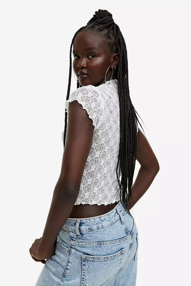 Short, fitted top in lace with a bubbly texture and overlocked edges. Stand-up collar and short sleeves.