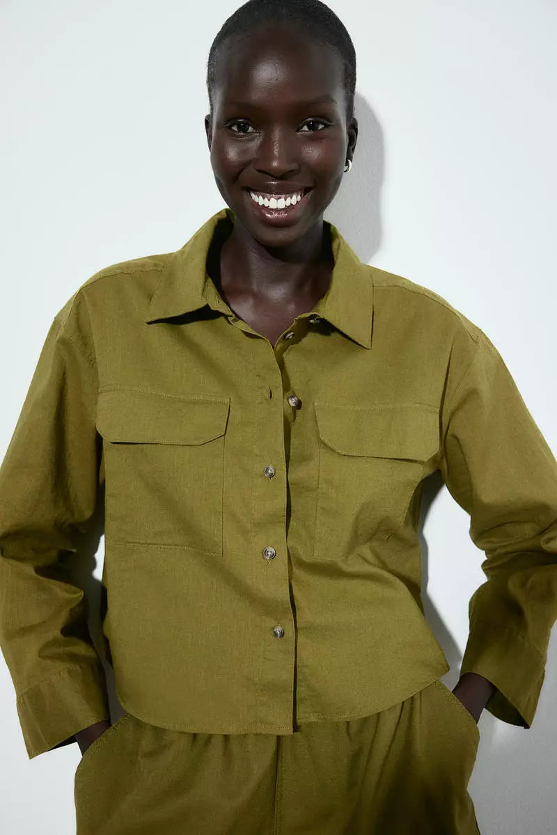 Unveil a touch of utilitarian chic with this Olive Green Linen-Blend Utility Shirt. Its cropped length paired with a loose fit encapsulates effortless style, while the linen and cotton blend speaks to your commitment to comfort and sustainability. Designed for the modern woman who appreciates a blend of functionality and fashion.