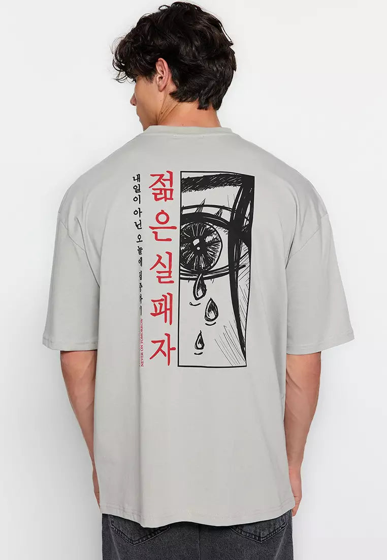 Men's Gray Oversize/Wide Cut 100% Cotton Far Eastern Anime Printed T-Shirt