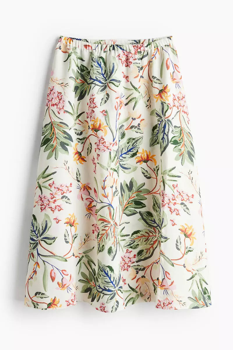 Embrace the allure of nature's beauty with this captivating midi skirt from H&M. A canvas of black, light beige, and cream hues serves as the background for a striking floral pattern that seems to dance across the fabric. The high, elasticated waist promises ease of wear and a flattering fit that accentuates your silhouette, while the calf-length cut offers a sophisticated yet playful charm, perfect for diverse fashion styles.
