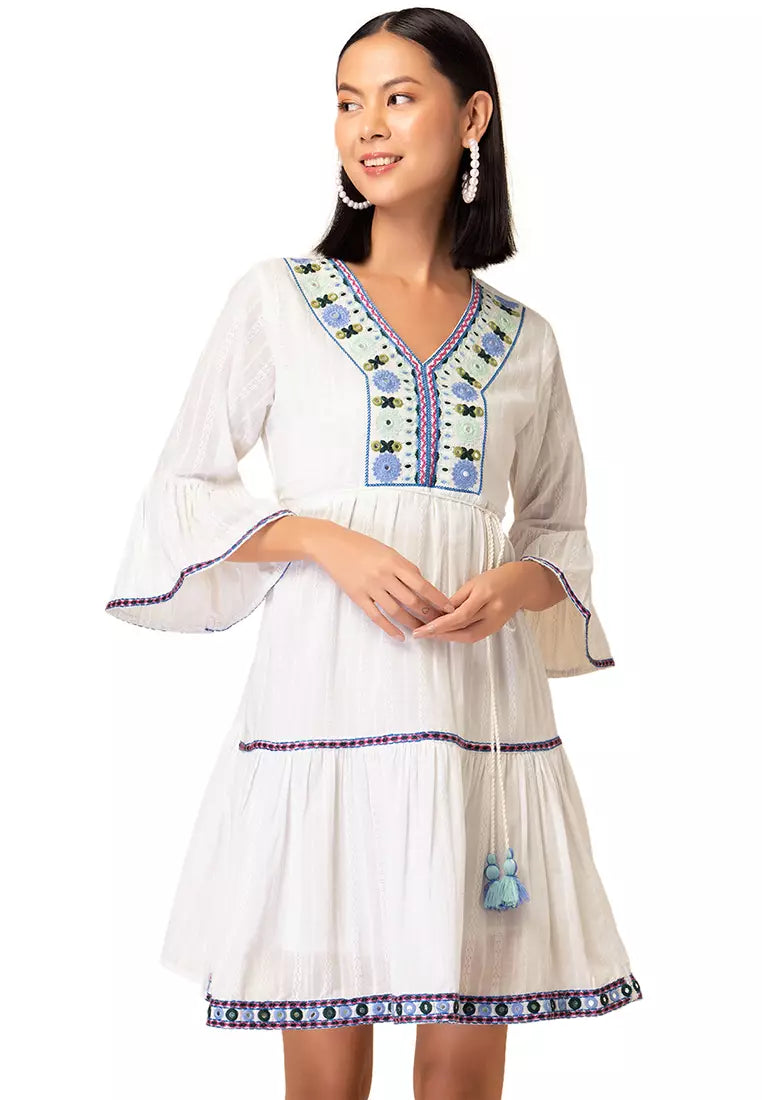 This Off White Thread Embroidered Tiered Dress showcases a blend of classic charm and bohemian elegance. It features intricate thread embroidery with pops of color around the neckline and hem, complemented by the playful tiered skirt and flared sleeves. Ideal for sunny days out or festive gatherings, it’s a wardrobe essential for those who love a touch of artisanal craftsmanship.