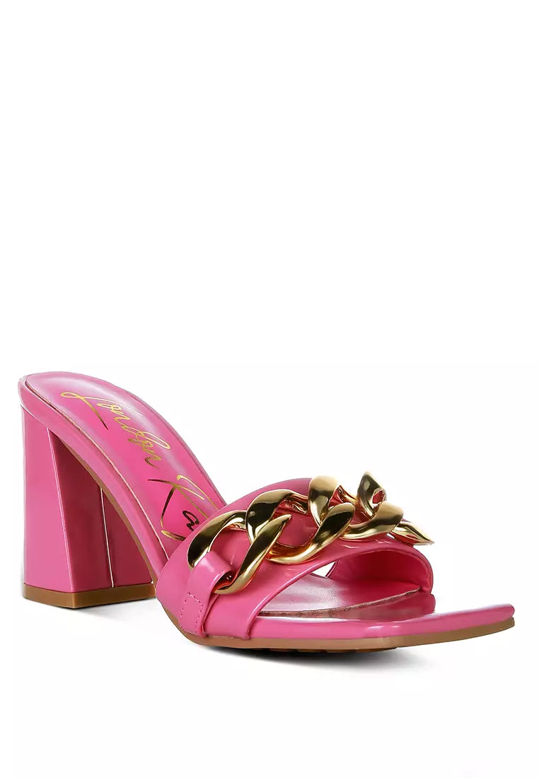 Crafted with great finish and construction, this pair of patent PU block heeled sandals have the catchy metal chain detail on top. It has interesting outsole which is groovy and anti slip on all surfaces.