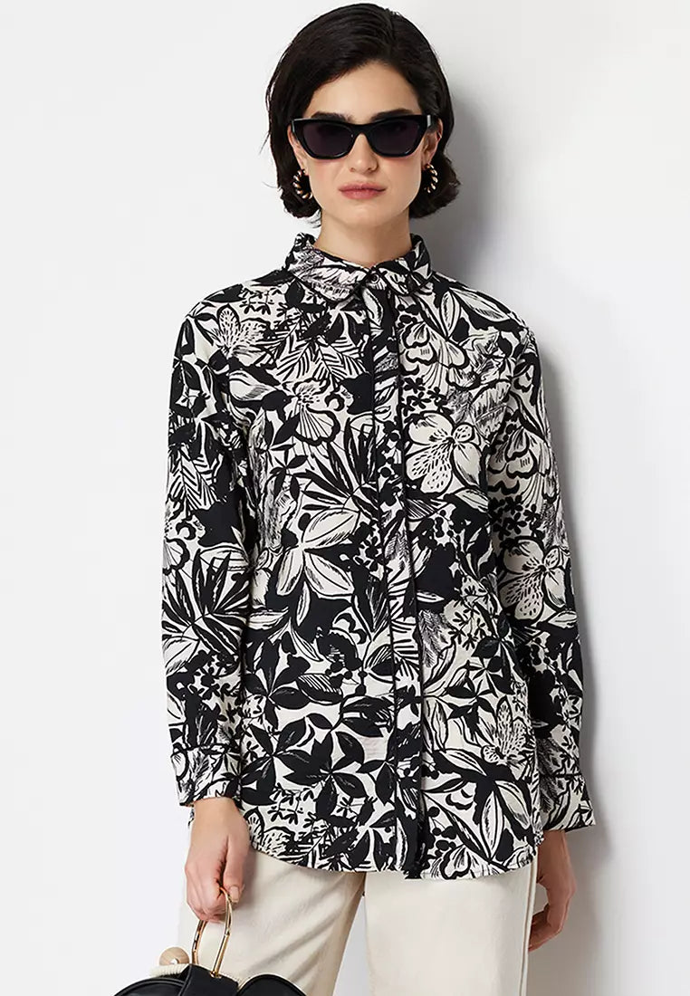 Embrace elegance with this Piping Detailed Floral Shirt, a must-have for any wardrobe that appreciates the blend of classic style and modern flair. Featuring a striking black and white floral print, this shirt adds a touch of nature-inspired beauty to your outfit. The unique piping detail accentuates the sophisticated structure, providing a contour that flatters the form. Crafted with a comfortable fit and finished with a high collar, it's perfect for both office wear and casual outings.