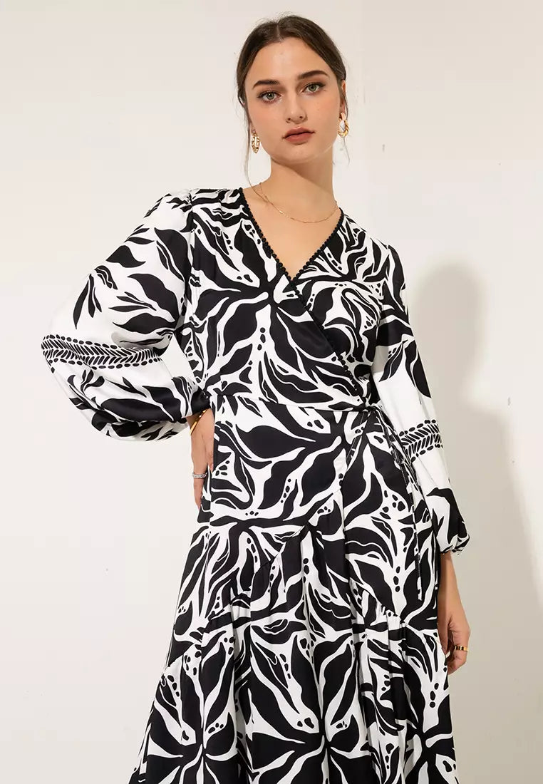 The surplice V-neckline elegantly frames the décolletage while remaining modest, and the waist tie fastening cinches in to highlight the silhouette, offering a flattering shape for all body types. The long puff sleeves add a trendy and sophisticated touch to this statement piece.