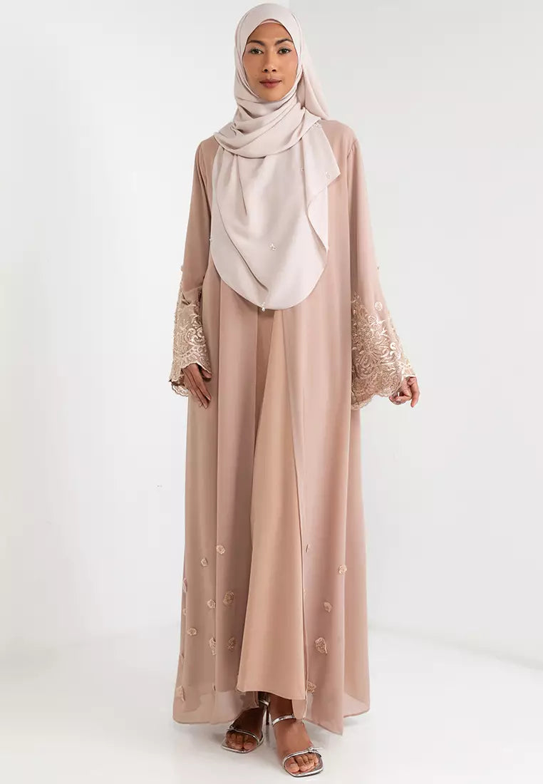 Long sleeves culminate in lace cuffs, echoing the detailed work throughout the garment and enhancing its overall aesthetic. Whether for a special occasion or everyday wear, the Safiya Abaya sets a tone of understated luxury and is a testament to modest fashion at its finest.
