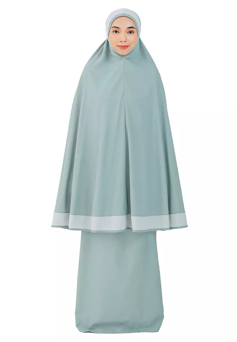 The set is elegantly designed with a lace embellishment featuring repeating circle motifs, a tribute to the intricate and historic Turkish Ottoman art. The lace is dyed to match the gentle Iceberg Green of the telekung, resulting in a subtle and sophisticated aesthetic that complements the devout spirit of the wearer.
