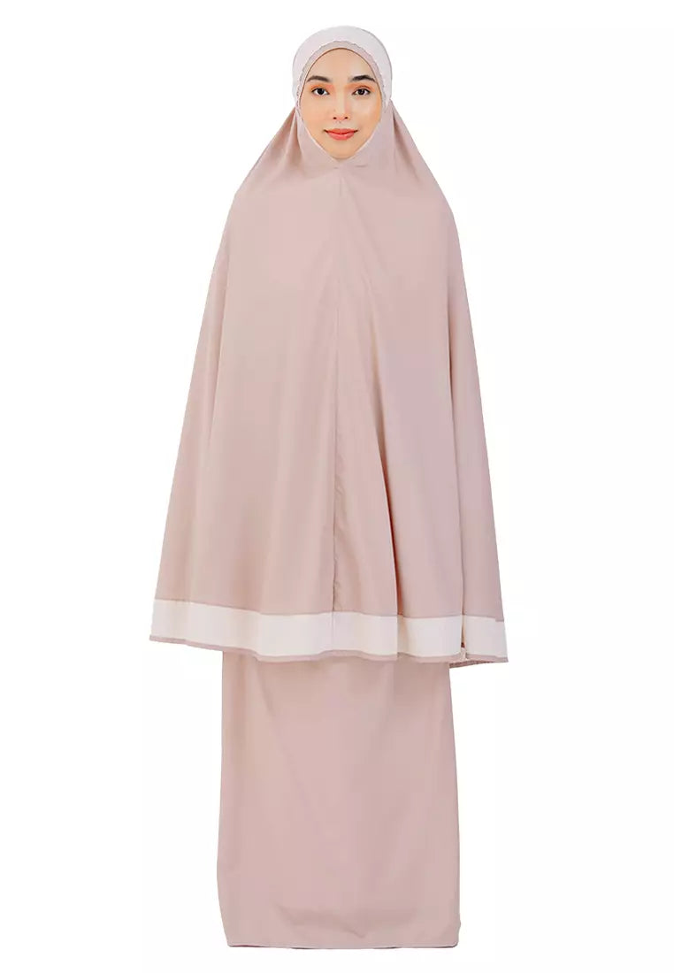 Immerse in the delicate embrace of the Siti Khadijah Telekung Broderie Yuzuk, presented in a subtle Mohagany Rose hue. Meticulously designed for the devoted, this telekung set, comprising a top and skirt, is tailored from Khadijah Basic Poplin. This fabric selection promises durability and lightweight ease, while also offering a cooling sensation, essential for maintaining comfort during your times of prayer.