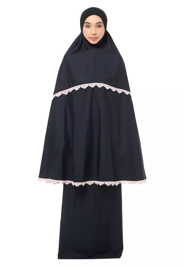 What sets this telekung apart is the delicate lace detailing, meticulously inspired by the jasmine flower's elegance, which adds a touch of understated beauty to the solid black fabric. The slim lace edging harmonizes with the telekung's color, enhancing the silhouette and adding a modern crop-cut look across the body that's uniquely stylish.