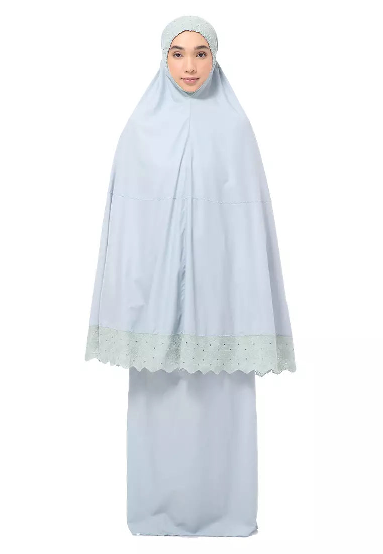 Each piece showcases high-quality cotton lace delicately wrought with a unique motif inspired by the grandeur of Turkish Ottoman art. The design features the elegance of Turkish roses entwined with detailed geometric patterns, offering an expression of faith and fashion. The matching pale green lace is carefully sized to complement the telekung body, presenting a refined aesthetic that harmonizes tradition with modern sensibilities.
