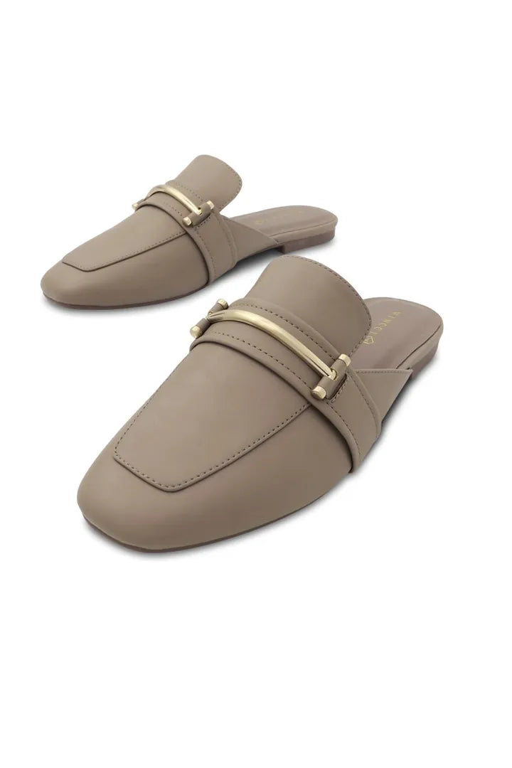 Slip on casual ladies pump, Round toe, Single strap with gold tone metallic hardware on shoe detailing, Polyurethane insole and outsole, Taupe color.