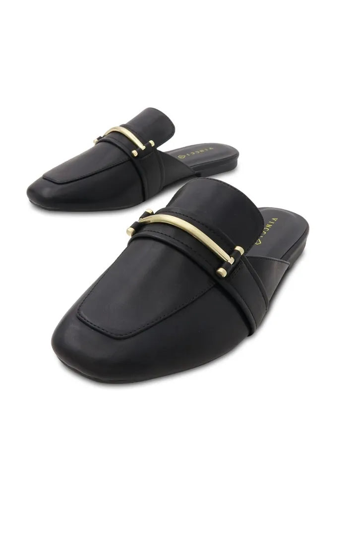 Slip on casual ladies pump, Round toe, Single strap with gold tone metallic hardware on shoe detailing, Polyurethane insole and outsole, Black color.