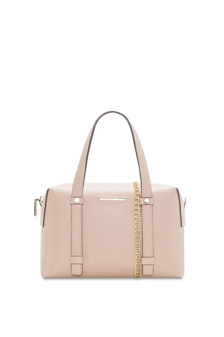 Discover timeless charm with our sophisticated satchel bag. Secured by a sleek zip closure, it blends style with practicality. The metallic chain shoulder strap adds a hint of glamour, while an internal slot pocket keeps your essentials organized. Adorned with a gold tone metallic brand plaque, it exudes luxury and refinement.