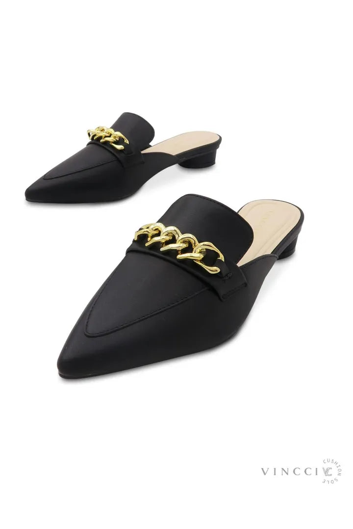 Casual pointy toe comfort pump, Single strap with gold tone metallic chain strap on shoe detailing, Cushioned footbed gives lasting comfort, Black color.