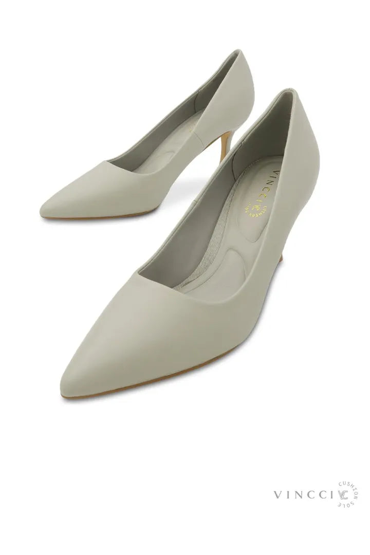 Pointy toe work court, Slip on style, Cushioned footbed gives lasting comfort, Kitten heel, Polyurethane insole and outsole, Grey color.