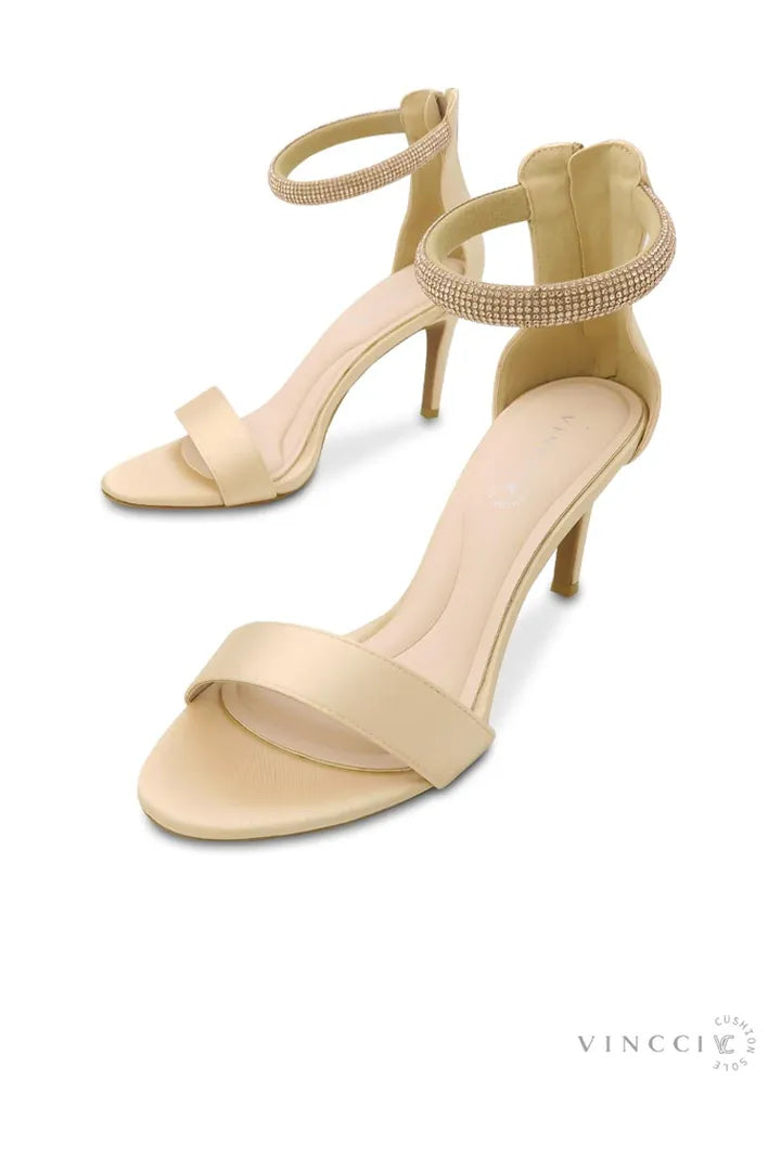Open toe work heel, Twin fabric strap with diamante embellishment on detailing, Cushioned footbed gives lasting comfort, Kitten heel, Champagne color.