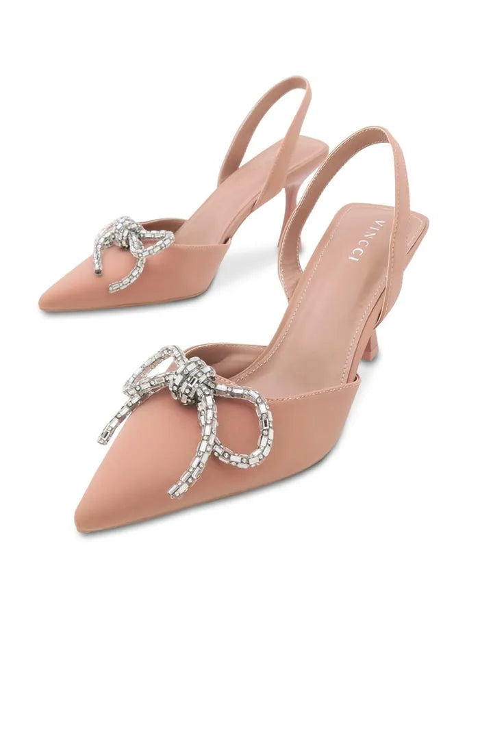 Slip on work heel with pointy toe, Bow inspired embellishment on shoe detailing, Slingback strap, Kitten heel, Pink color.