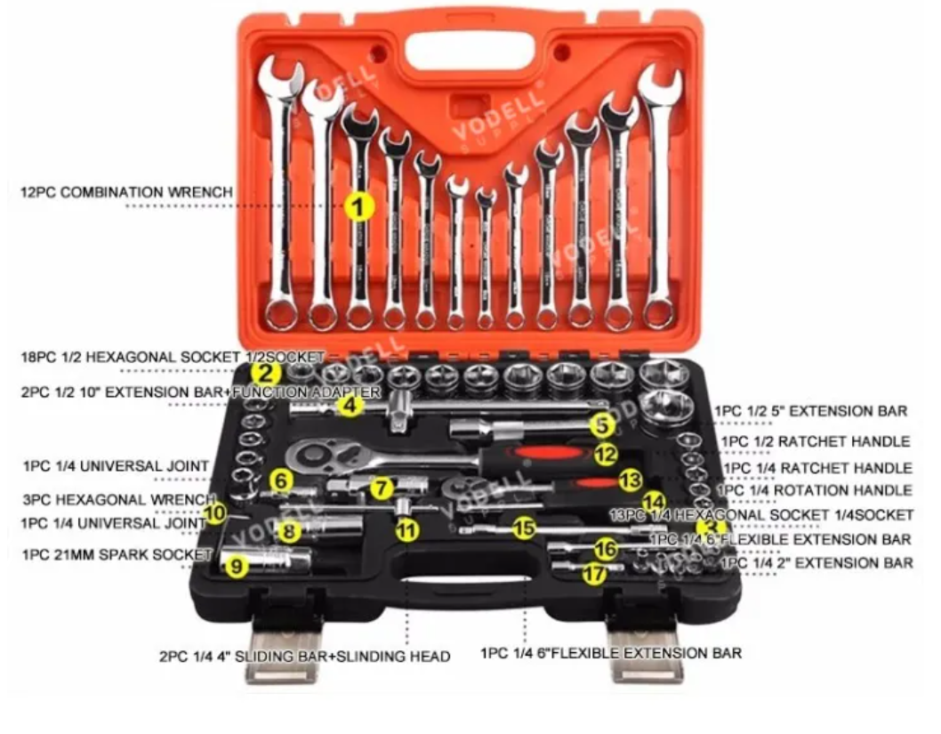 VODELL Original 61pcs Tools Set Combination Socket Wrench Ratchet Spanner Box Power Tool Car Motor Spark Plug Engine Tools Set Hardware Storage Box Heavy Duty Car Workshop Repair Socket Wrench Alat -By Sea Courier Method🚢📦