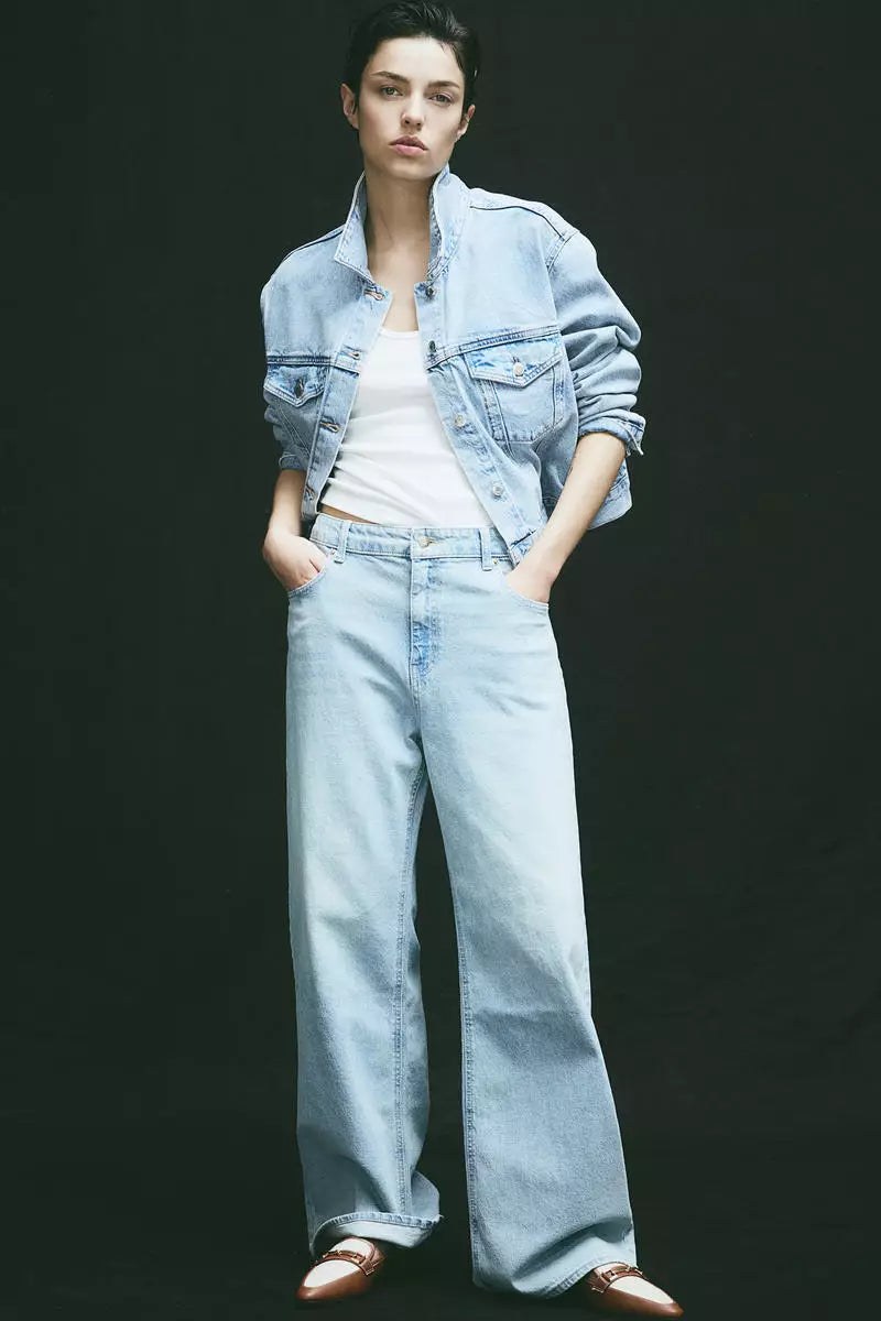 The image displays a model wearing a relaxed-fit denim jacket over a simple white tank top, paired with wide-leg high-waisted jeans. The light wash of the denim offers a classic and versatile look, while the oversized jacket adds a modern, edgy vibe to the ensemble. The look is completed with a pair of simple flats, creating an effortlessly chic outfit that plays with proportions and textures. This outfit is a great example of casual yet fashionable streetwear.